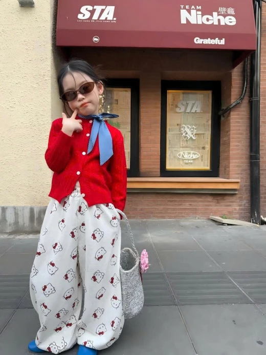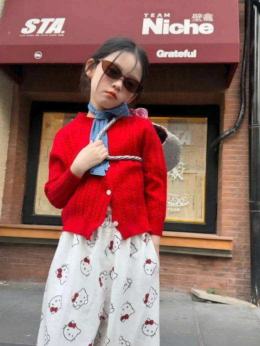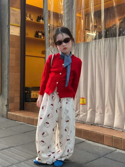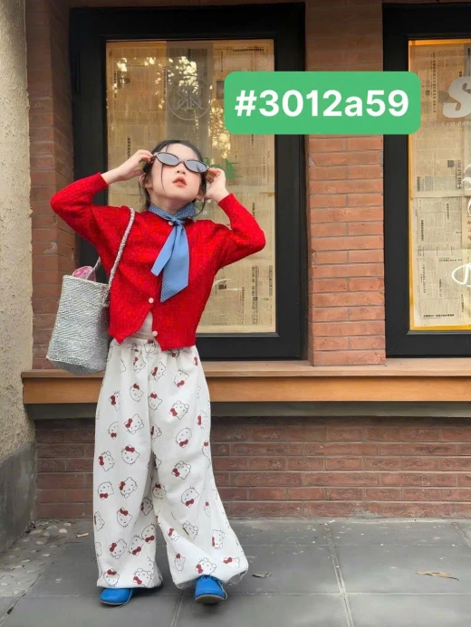 #3012a59 ÁO LEN CARDIGAN ĐỎ MIX QUẦN KITTY Gu basic mà nổi bật cả góc phố Áo #xxxk Quần #xxxk Sz: 90-140 Giá: áo 161k, quần 152k chốt 3012