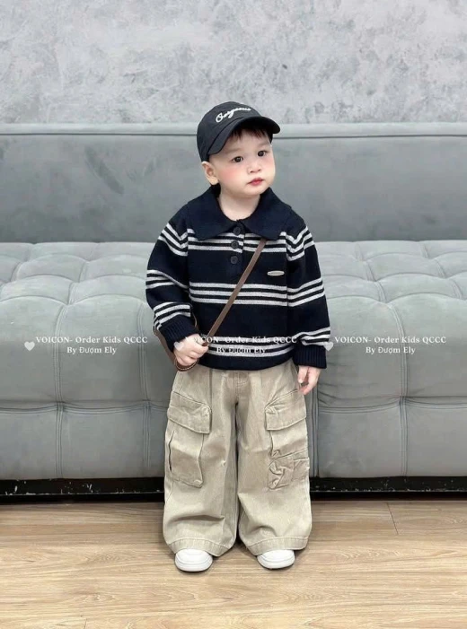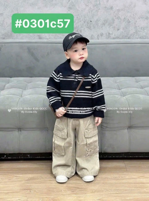 #0301c57 ÁO LEN POLO MAIBAO MIX QUẦN THÔ MUZI Áo len #xxxk sz: 90 100 110 120 130 140 Quần 2 màu: Kem - Nâu sz 80 100 110 120 130 (Hàng ghép set nên có thể áo hoặc quần về trước nhé các xốp) Giá : áo 183k, quần 195k Chốt 0301