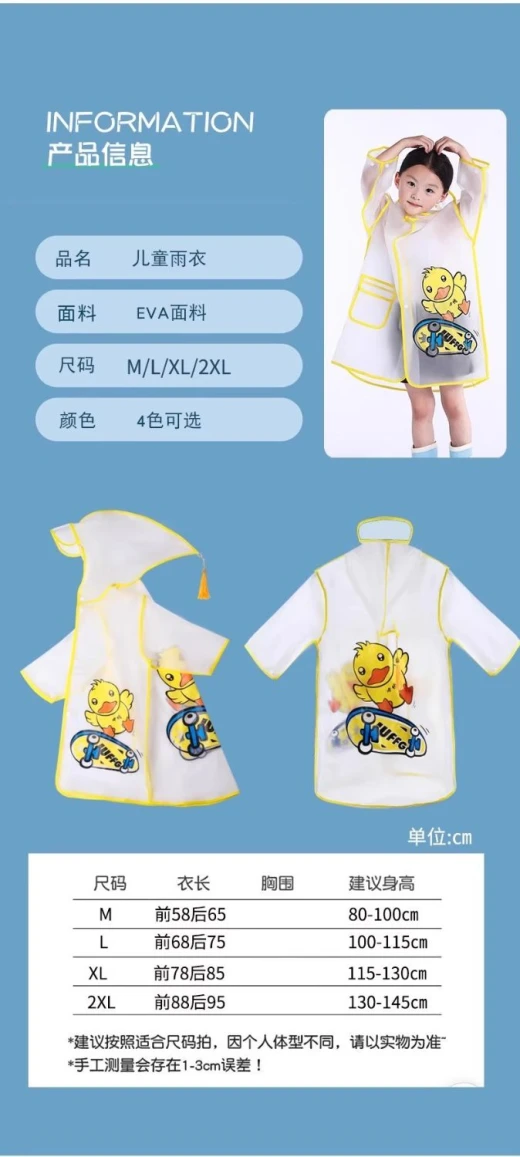 #1509a53 ‼‼‼ ÁO MƯA CHO BÉ #xxk/c Đúng mùa mưa rồi các mẹ ơi, sắm ngay thôi nào 👉🏻Áo rộng rãi kèm mũ to lắm hiệu quả che mưa tối đa nha 👉 Chất liệu EVA mềm mại và siêu nhẹ. ✅5 mẫu đánh số ✅sz M-2XL Bảng sz chi tiết theo chiều cao M:80-100cm L: 100-115cm XL: 115-130cm 2XL: 130-145cm Màu có thể đậm or nhạt hơn do hiệu ứng ánh sáng và góc chụp ==== chốt 15/9 giá 64k/1c