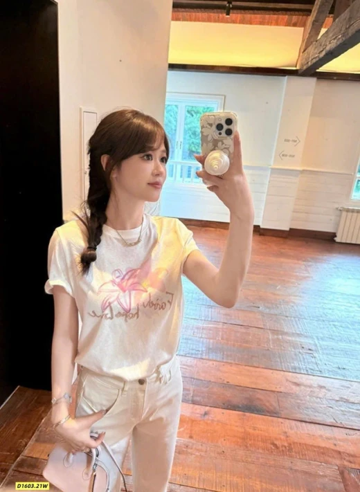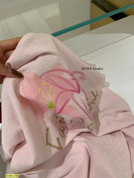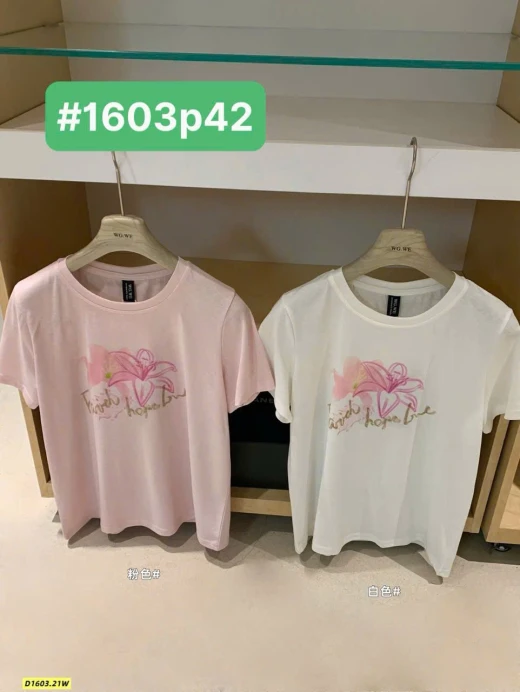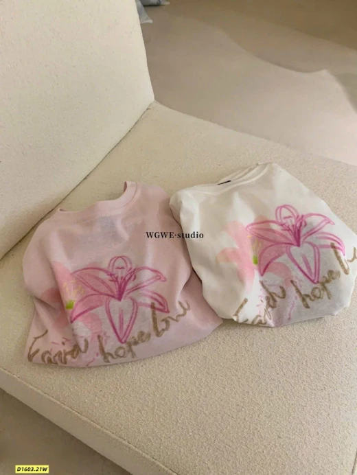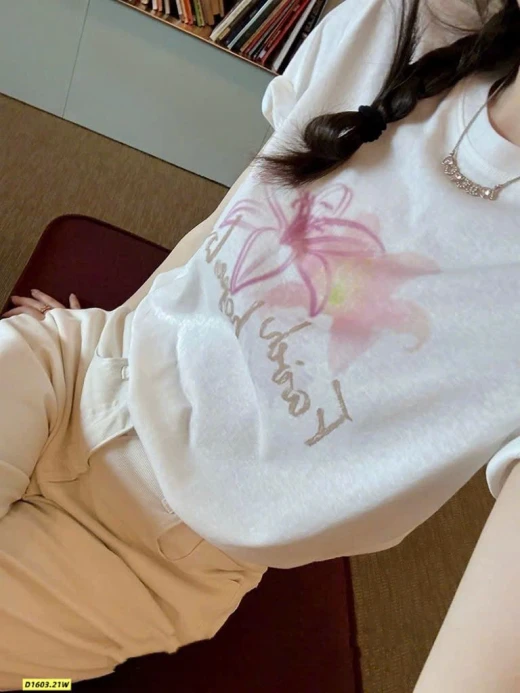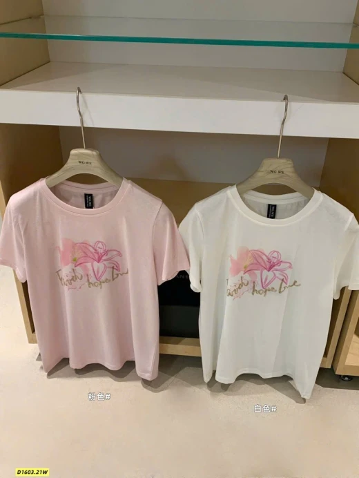 #1603p42 Áo phông hoa WGWE (9011)🌸 Thiết kế đơn giản, in hoa nhẹ nhàng nữ tính, mặc lên trẻ trung và dễ phối đồ. Chất vải mềm, form xinh mặc đi học – đi chơi đều hợp. • 2 màu: trắng , hồng • Fit dưới 60kg Giá: 125k Chốt 1603