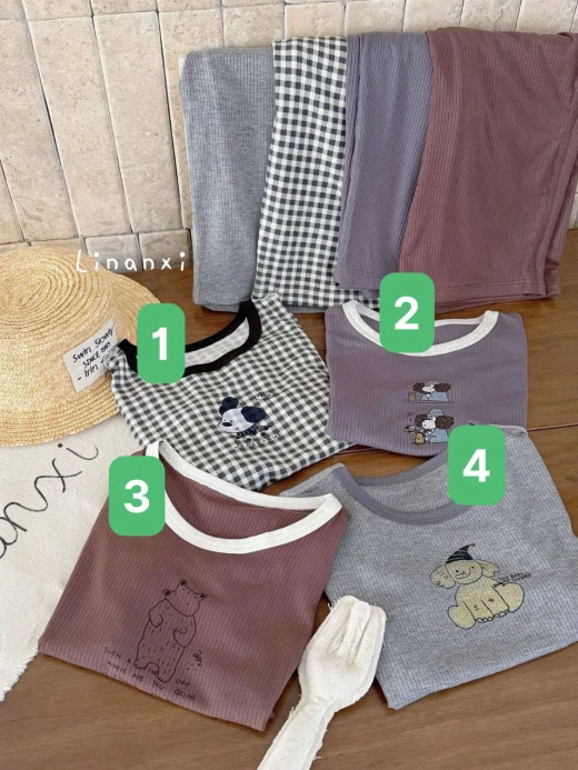 #2103p48 BỘ THUN GÂN MẶC NHÀ LINANXI MẪU MỚI #xxxk/ bộ , từ 2b còn xxxk 4 mẫu như hình đánh số Sz: 90-140 Size tham khảo: 90: ~10–12kg 100: ~12–14kg 110: ~14–16kg 120: ~16–18kg 130: ~18–21kg 140: ~21–25kg giá: 152k chốt 2103