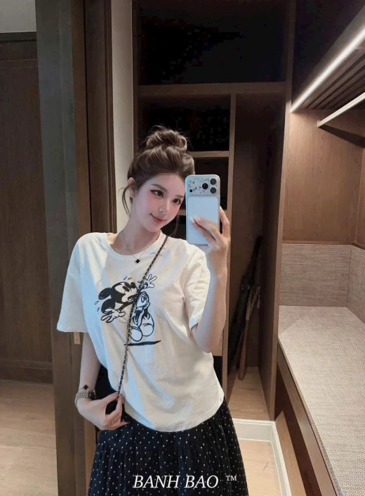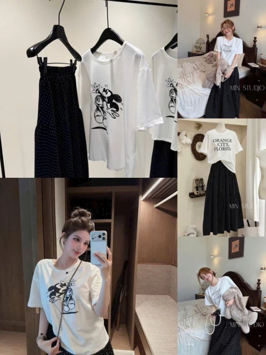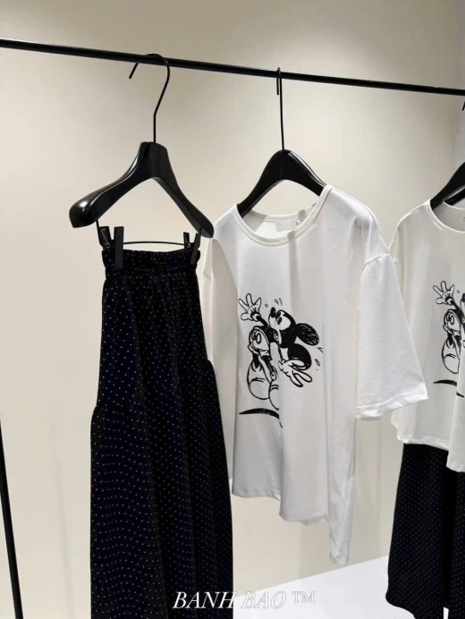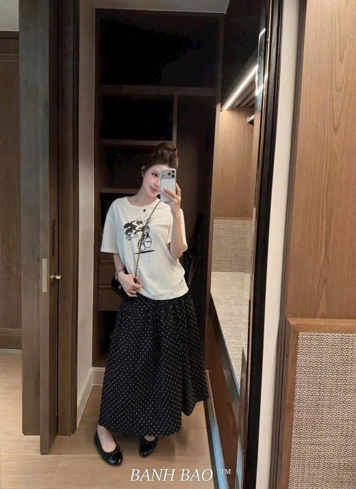 #0604p57 Rõ xinh, sét cv chấm bi mix phông trắng in micky ☘️ dáng váy xoè che khuyết điểm tốt mà vẫn mềm mại nữ tính. # Vải mềm mát k nhăn mng nhe. Size s 40/46kg M 47/53kg L 53/60kg ☘️Giá: 167k 🐬Chốt 6/4- hàng việt