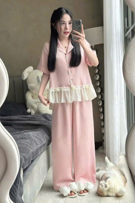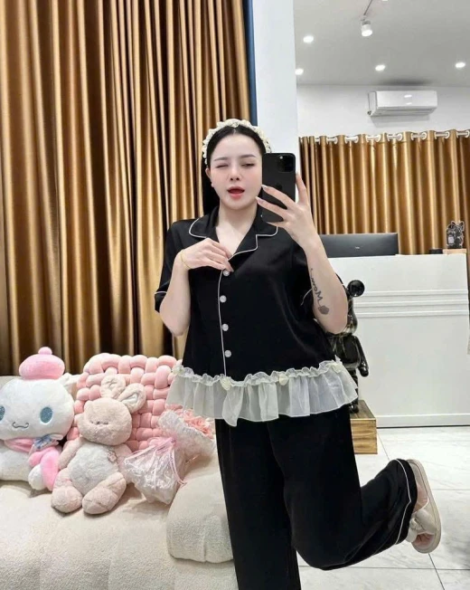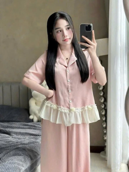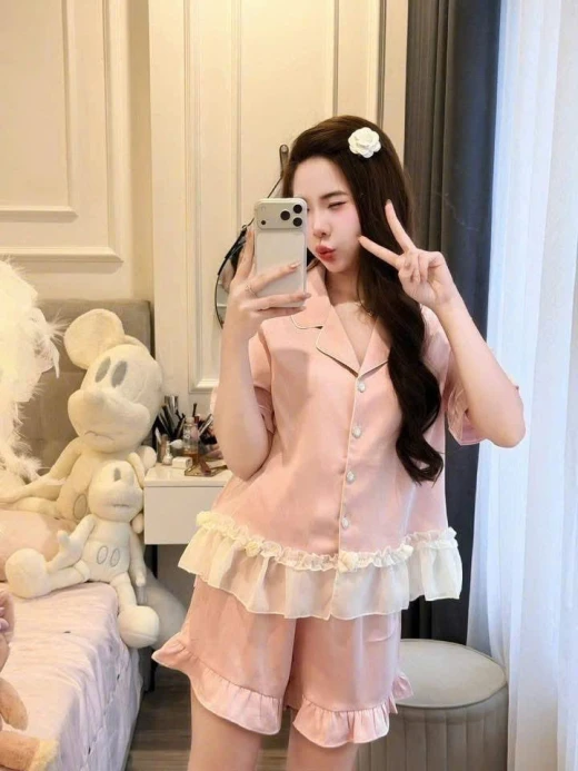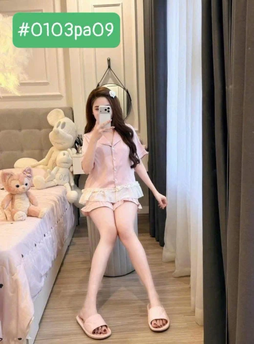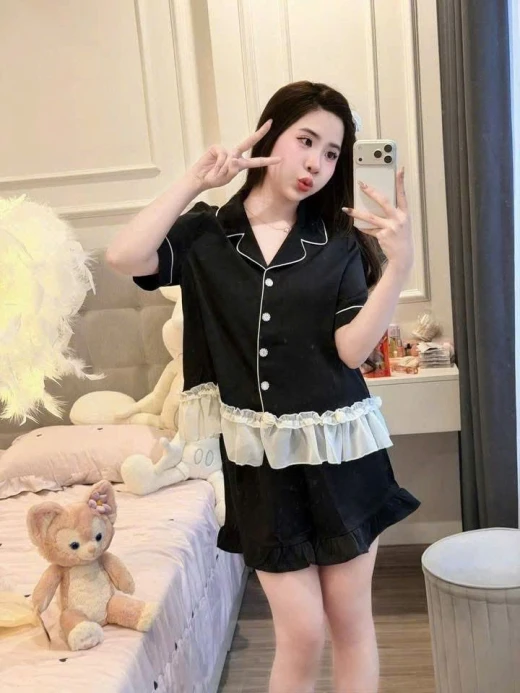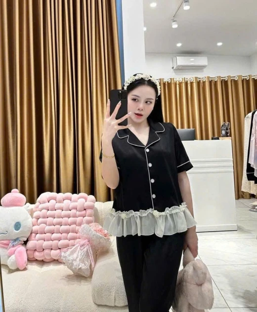 #0103pa09 ✨ SET LỤA ĐEN VIỀN TRẮNG BÈO VOAN – SANG & MỀM MÁT ✨ Set thiết kế phong cách pijama cao cấp với chất lụa mềm mịn, rũ nhẹ, bề mặt mượt, mặc cực kỳ dễ chịu. Phần bèo voan trắng tạo điểm nhấn nữ tính, nhìn rất sang và tinh tế 🖤 • Lụa cao cấp: mềm – mát – không thô • Mặc thoải mái cả ngày, không bí • Áo cổ pijama viền trắng, tay dài thanh lịch • Bèo voan mềm ở lai áo, che bụng nhẹ • Quần suông lưng thun, dễ mặc – dễ vận động 2 màu : đen, hồng , dáng dài -đùi 📏 SIZE: • S: 40 – 48kg • M: 49 – 55kg • L: 56 – 62kg ☘️Giá : set quần cộc 119k Set quần dài 134k 🐬Chốt 1/3